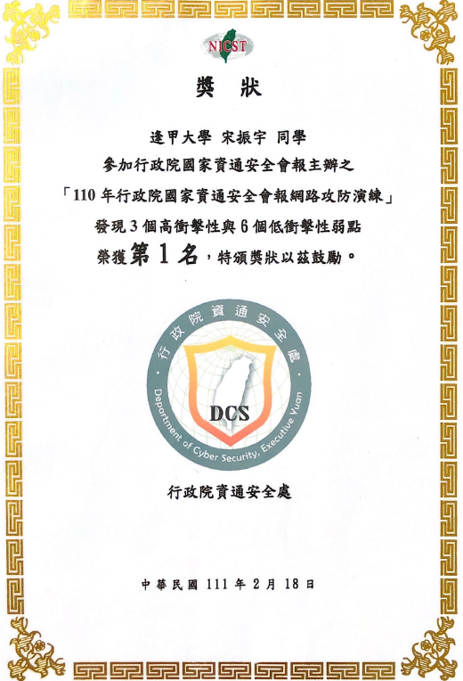 逢甲大學資訊工程學系宋振宇同學參與「110年行政院國家資通安全會報網路攻防演練」發現3個高衝擊性與6個低衝擊性弱點,並於56位攻擊手中,榮獲第一名佳績!此項網路攻防演練,首先由行政院資通安全處邀集數百位選手參與遴選,一旦通過相關測試,能力符合之學員才能加入攻擊測試的行列,要再從精挑百選的攻擊手中拿下第一,相當不容易!