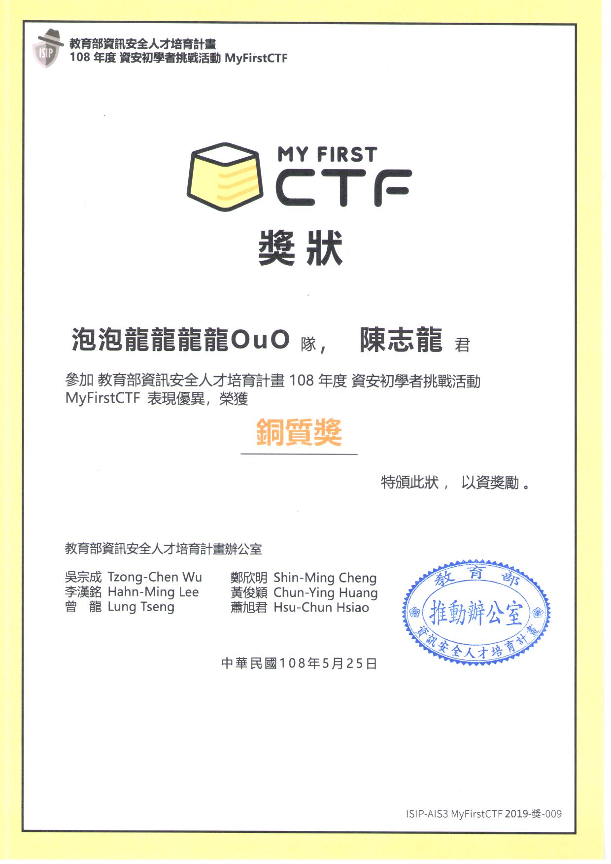 本計畫旨在建構培育資安人才之優良健全環境,厚植我國資安實力。為啟發學生對資安學習的興趣,教育部資訊安全人才培育計畫推動辦公室舉辦MyFirstCTF資安初學者挑戰活動。透過 CTF 競賽模式,期能鼓舞學生對資訊安全的學習熱情,以及提供國內資安學子相互切磋資安實務能力的機會。