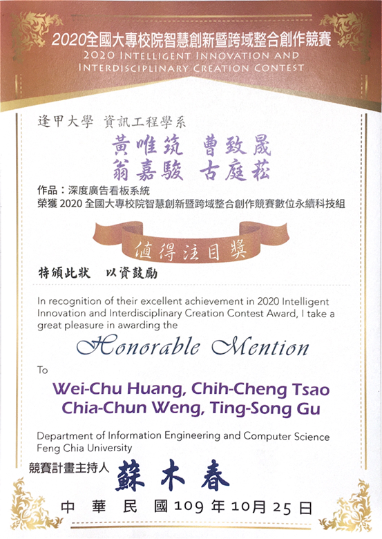 陳烈武老師指導學生獲2020智創暨跨整競賽值得注目獎