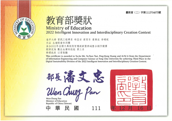陳烈武老師指導學生時昱安、蔡育岑、黃秉泓和李璦妮榮獲2022全國大專校院智慧創新暨跨域整合創作競賽數位永續科技組第三名與獎金2萬元。