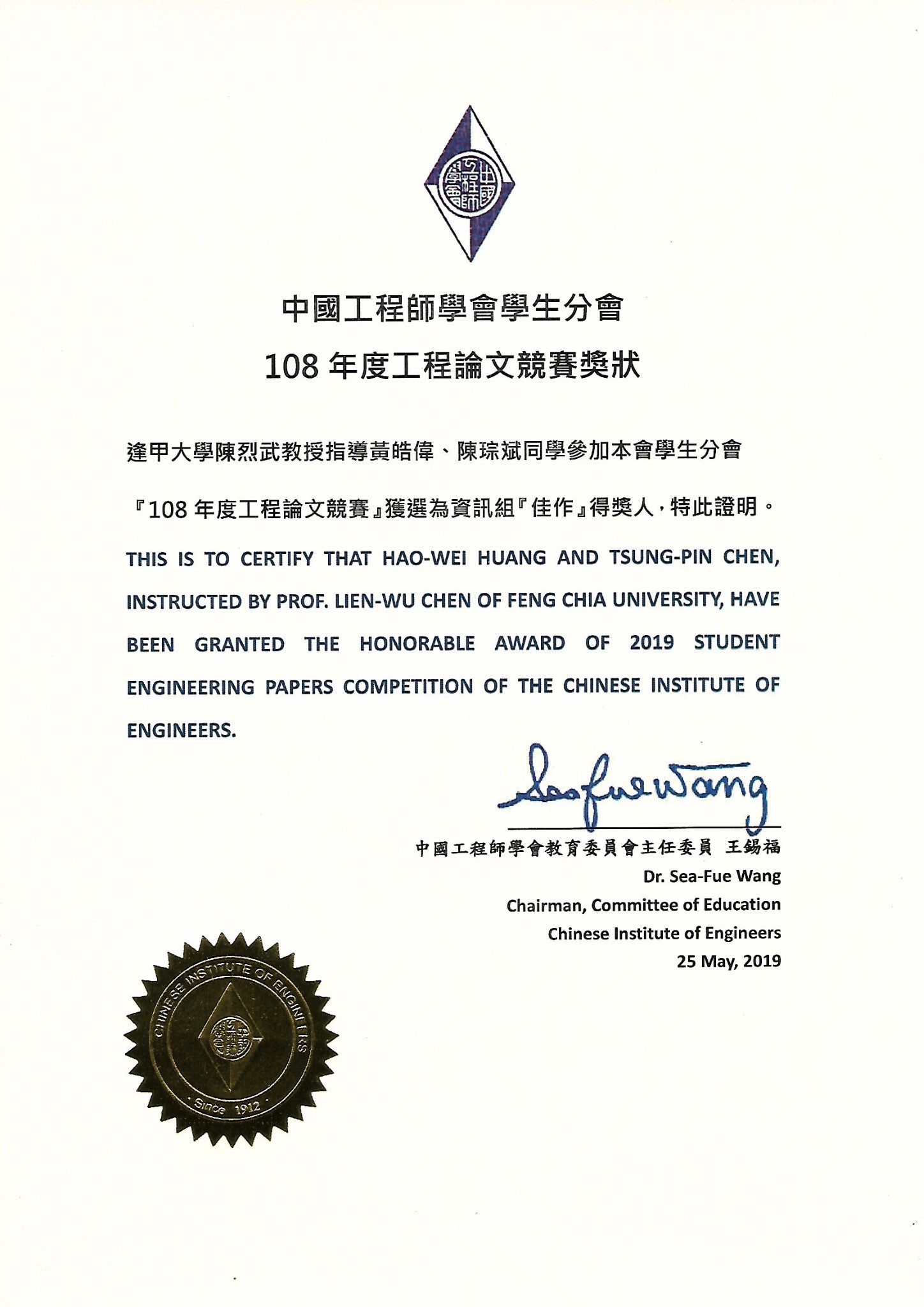 3 二月 陳烈武老師指導黃皓偉、陳琮斌獲工程師論文競賽佳作 由 陳烈武 系所亮點 1387 瀏覽 陳烈武老師指導學生黃皓偉、陳琮斌榮獲中國工程師學會學生工程論文競賽2019資訊組佳作 為激勵大專學生積極參與工程專題研究,進而在未來工作職場上,能學以致用,成為學養俱優之青年工程師,中國工程師學會特為在學學子提供相互切磋的學生競賽。 分享連結 複製成功! 複製 聯絡人 陳烈武 資電309-3