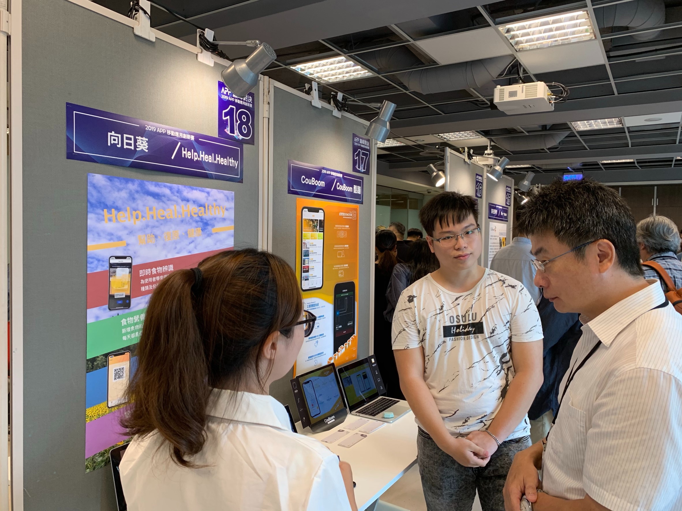 第三名則是來自本校的「向日葵」隊伍,團隊成員為資訊系黃郁洺、霍湛軒、曾昱翔同學,在許芳榮教授指導下,其作品「Help.Heal.Healthy」可以立即辨識並列出每種食物的營養成分,增加使用者的自我健康管理。
